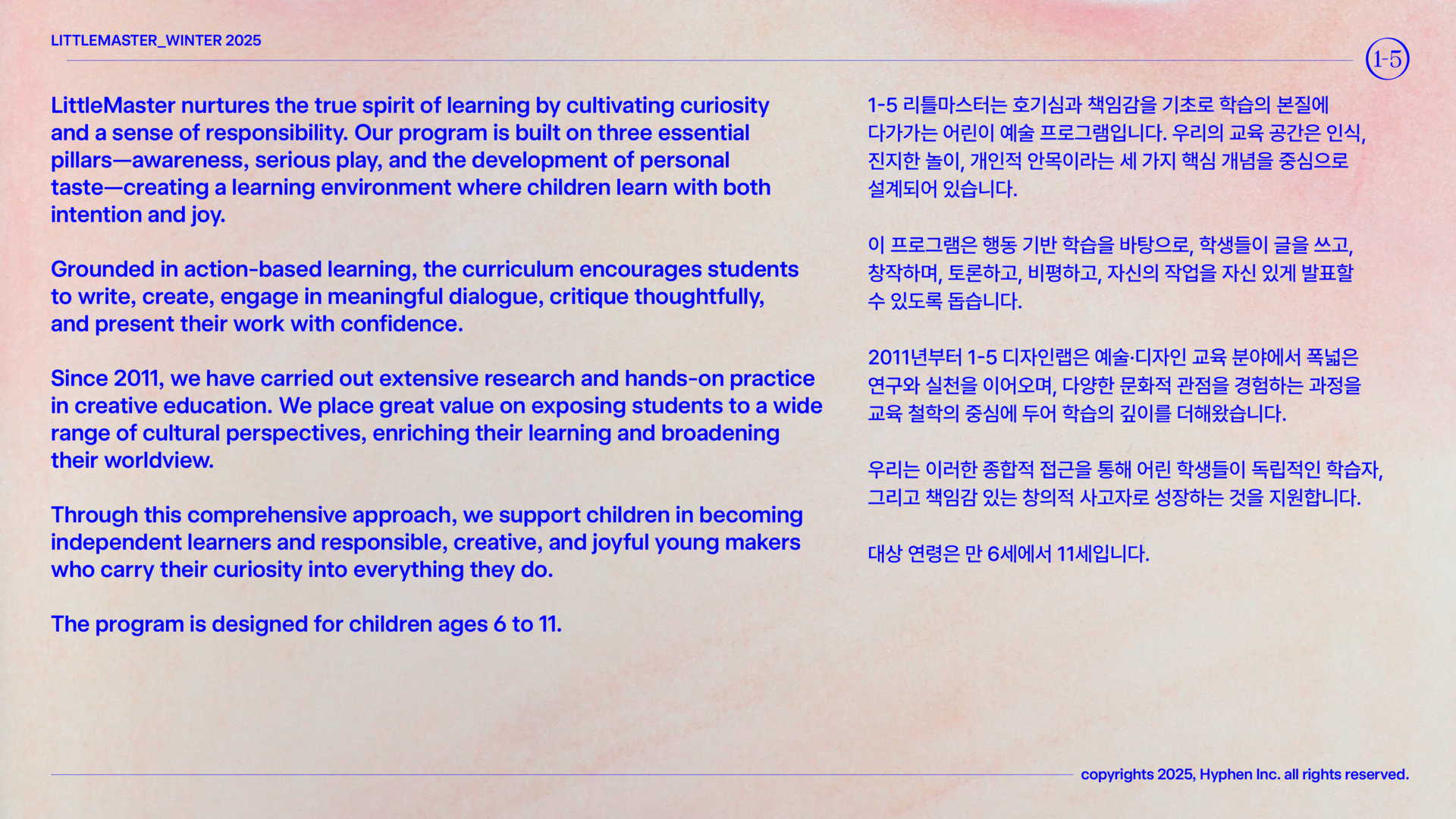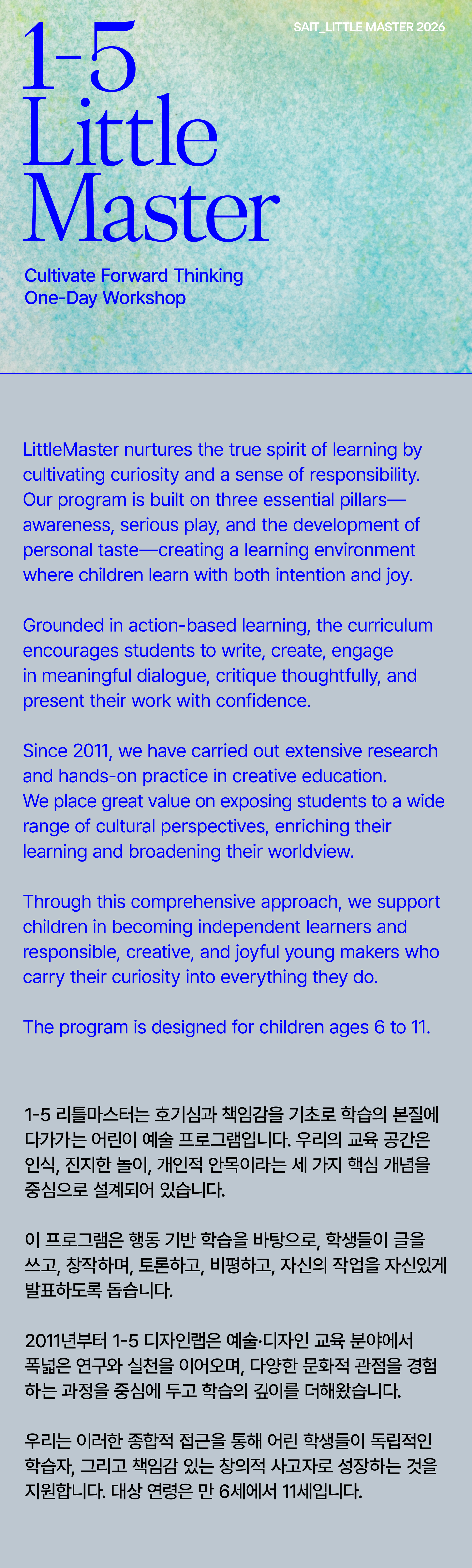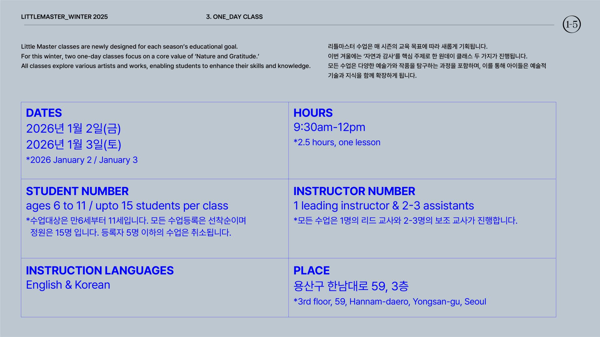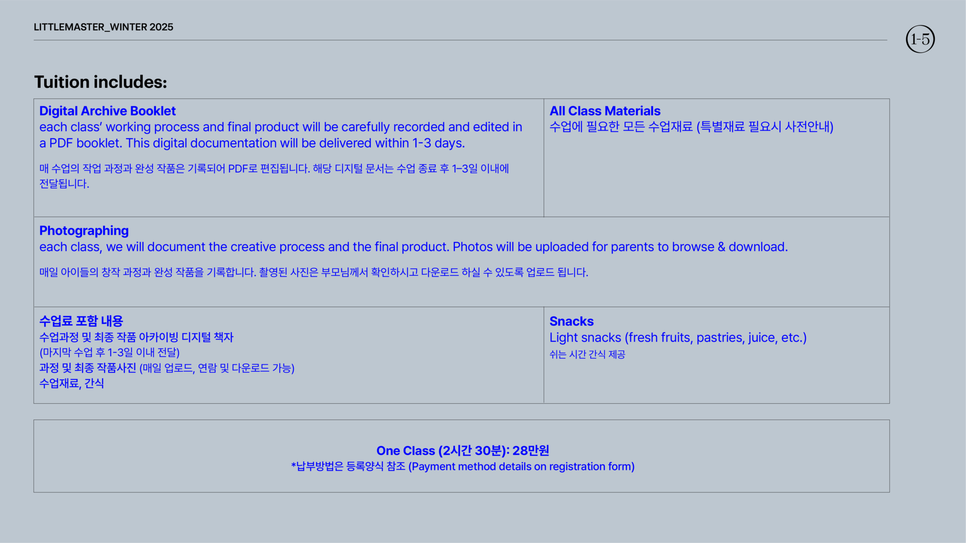 계좌이체 시 : A. 예금주: 1-5디자인랩 학원 (나웅주) B. 은행명: 기업은행 C. 계좌번호: 274-093186-04-010 *계좌이체시, 반드시 학생 이름 기재 부탁드립니다.